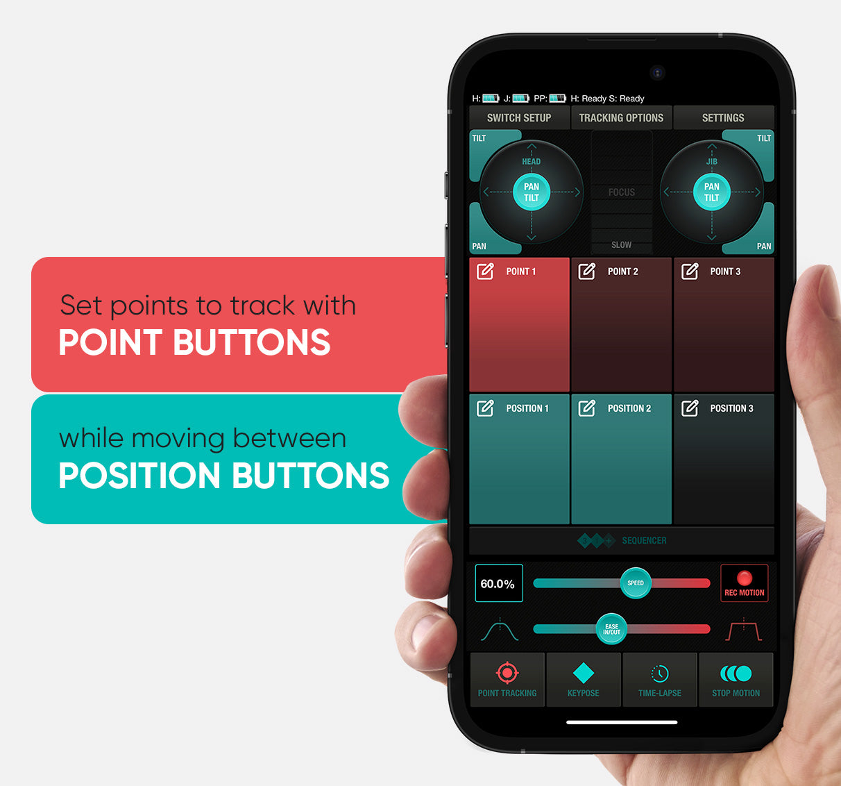 Point Buttons make the HeadPLUS lock on a point so once you trigger body motion by using any of the position buttons, HeadPLUS will adjust itself in realtime keeping the point locked on the frame.